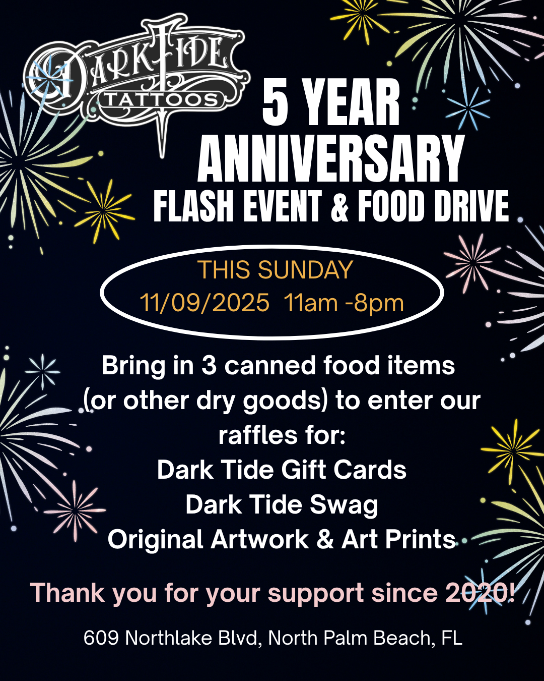 MARK YOUR CALENDARS! Dark Tide Tattoos is turning FIVE! Come celebrate with us for our FIVE YEAR FLASH EVENT!